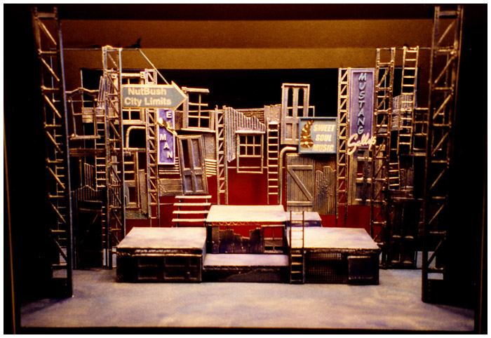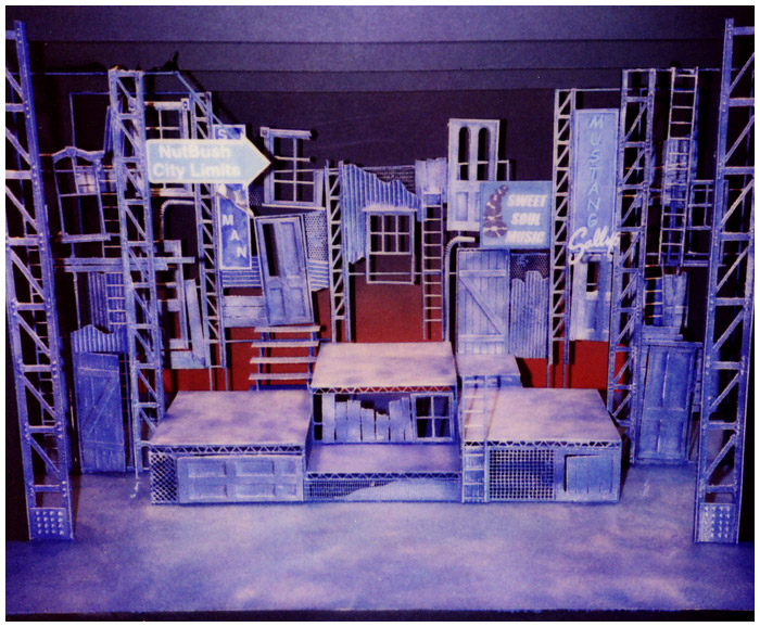 A concert tour of u.k. no 1 theatres the show was a celebration of all classic blues music. The set was to be a skeletal street scene with signs that I made in to puns .. a shoe shop called ' SOLE MAN ' and a street sign for ' NUTBUSH CITY LIMITS ' of course I had to make the entire set ..blue.