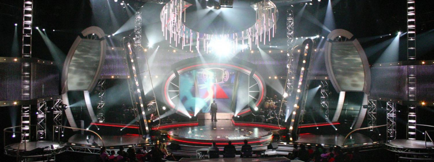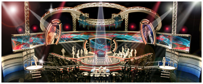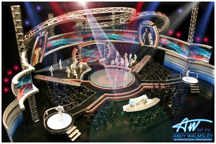 the ramped entrances left and right hinged upright on hydraulic rams and the central stage could raise up to 8 feet hydraulically. Video played a large part on this show with 3 rear projected screens, a wrap around l.e.d scrim and a video tube chandelier.