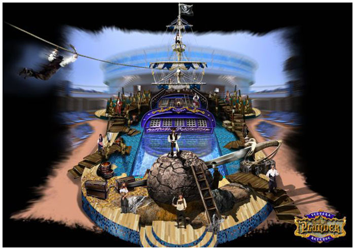 This Pirate stunt show had to load in to the public pool and pool deck in a matter of hours every week. I have designed 32 production shows for Jean Ann Ryan, widely considered the best producer of Cruise ship shows. These shows can still be seen cruising the world on Norweigan cruise line, P & O cruise lines and Cunard cruise lines.