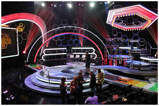 I was asked to design a new version of this show having done it previously for NBC. I suggested doing the show ' in the round ' to help create a party atmosphere for this karaoke extravaganza. My previous incarnation had been a safe prime time look but with this new version I decided to go whimsical and make this giant Juke box interior somewhere the viewers would want to spend 30 minutes.
