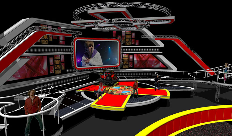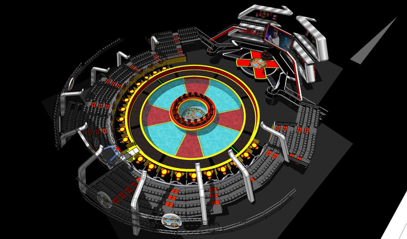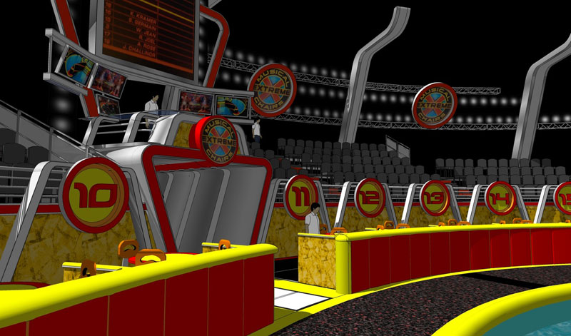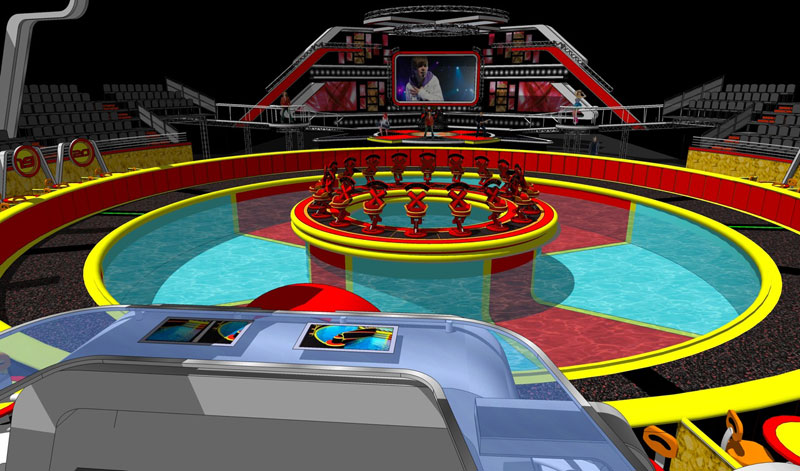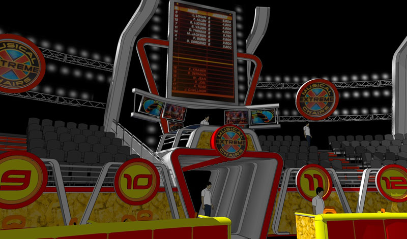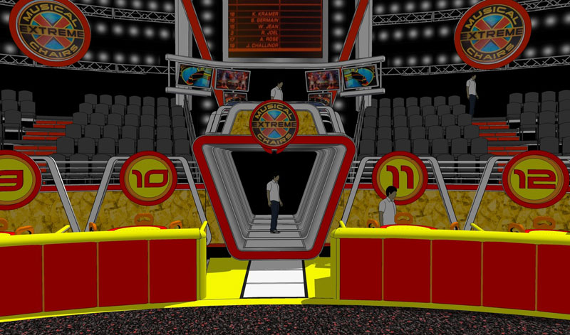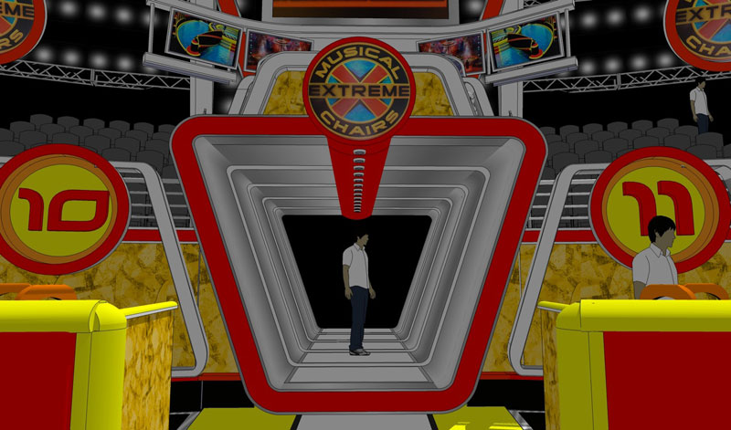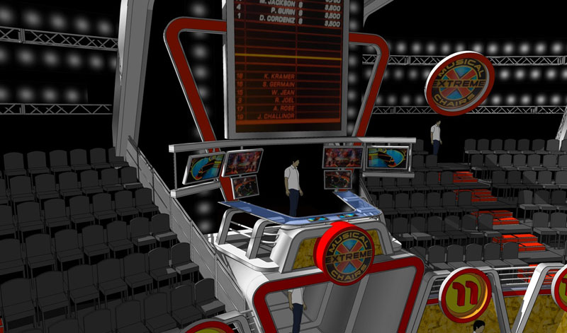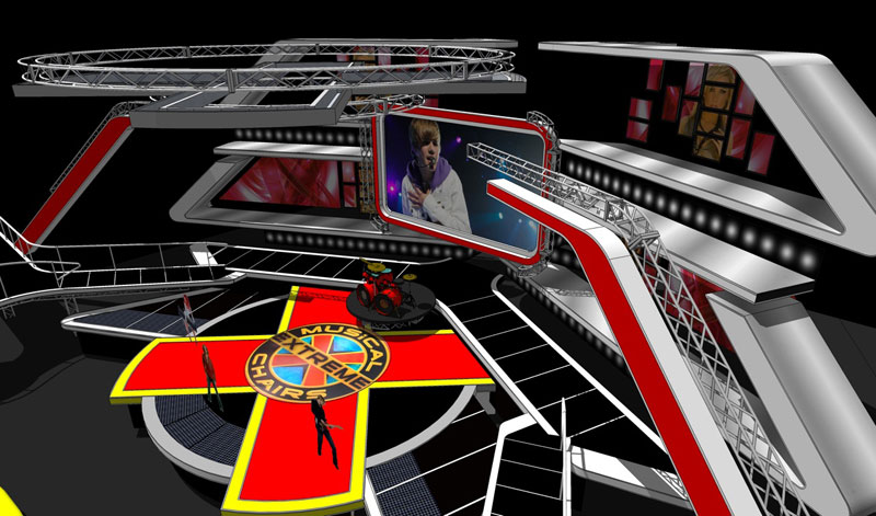 I was approached to design a crazy ambitious game show for the CW network based on Musical chairs. A sort of hybrid between American Idol and Wipeout. The set was extremely large shot on the famous Esther Williams stage at Sony studios. I designed not only a full scale band stage set but also the race track, tank area, dozens of complex games, the actual ' chairs ' a host area and even the locker rooms. Months of work that nearly killed me but it's a really fun show and certainly a different experience for me.