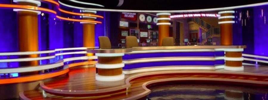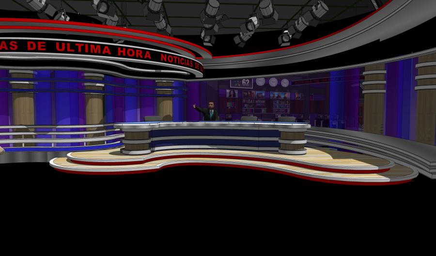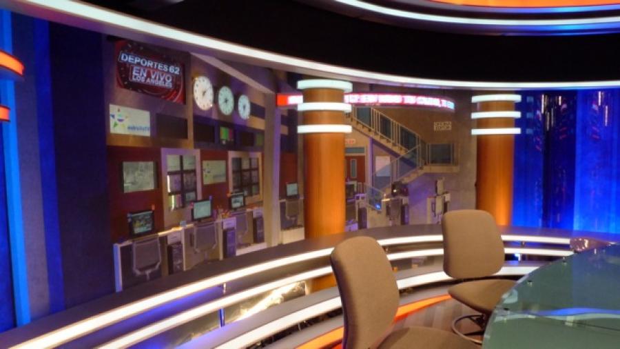 ESTRELLA TV'S LOCAL LOS ANGLES BASED NEWS IS AN IMPORTANT NEWS SOURCE FOR LATINO PEOPLE LIVING IN SOUTHERN CALIFORNIA. MY FAVORITE PART OF THIS SET IS THE FAKE ' NEWS ROOM OFFICE ' BEHIND THE SET, THIS IS IN FACT A FIVE FEET DEEP AREA WITH A MINIATURE FORCED PERSPECTIVE ROOM, TINY LITTLE FAKE DESKS A PINT SIZED STAIRCASE AND DOORS ADD TO THE ILLUSION
