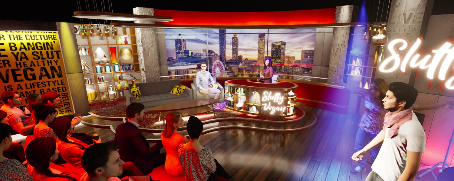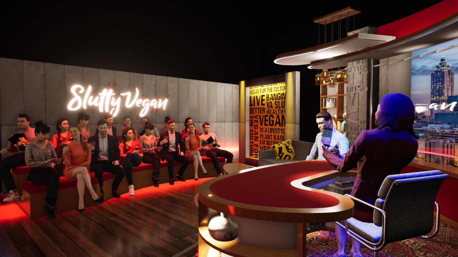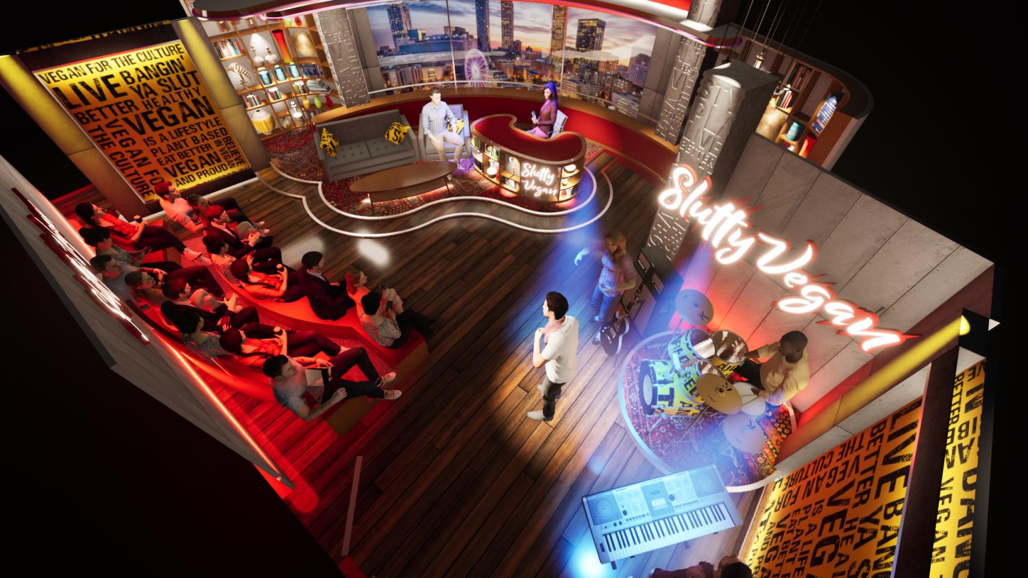 The highly successful Slutty Vegan restaurant chain approached me to create a small You Tube chat show set for them.  The set had to fit in an existing ( tiny ) warehouse space in Atlanta.