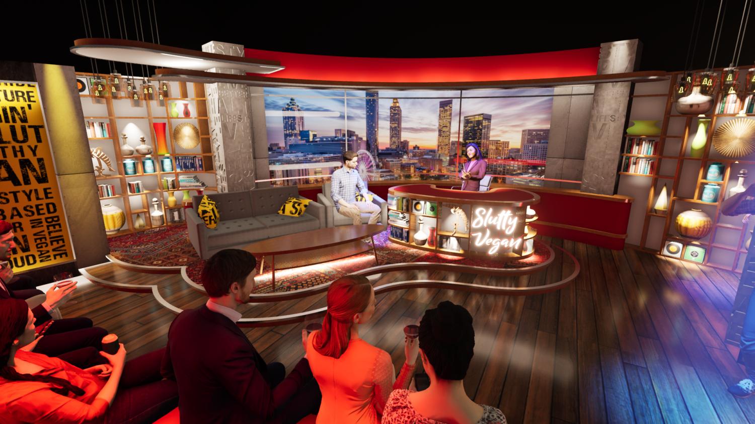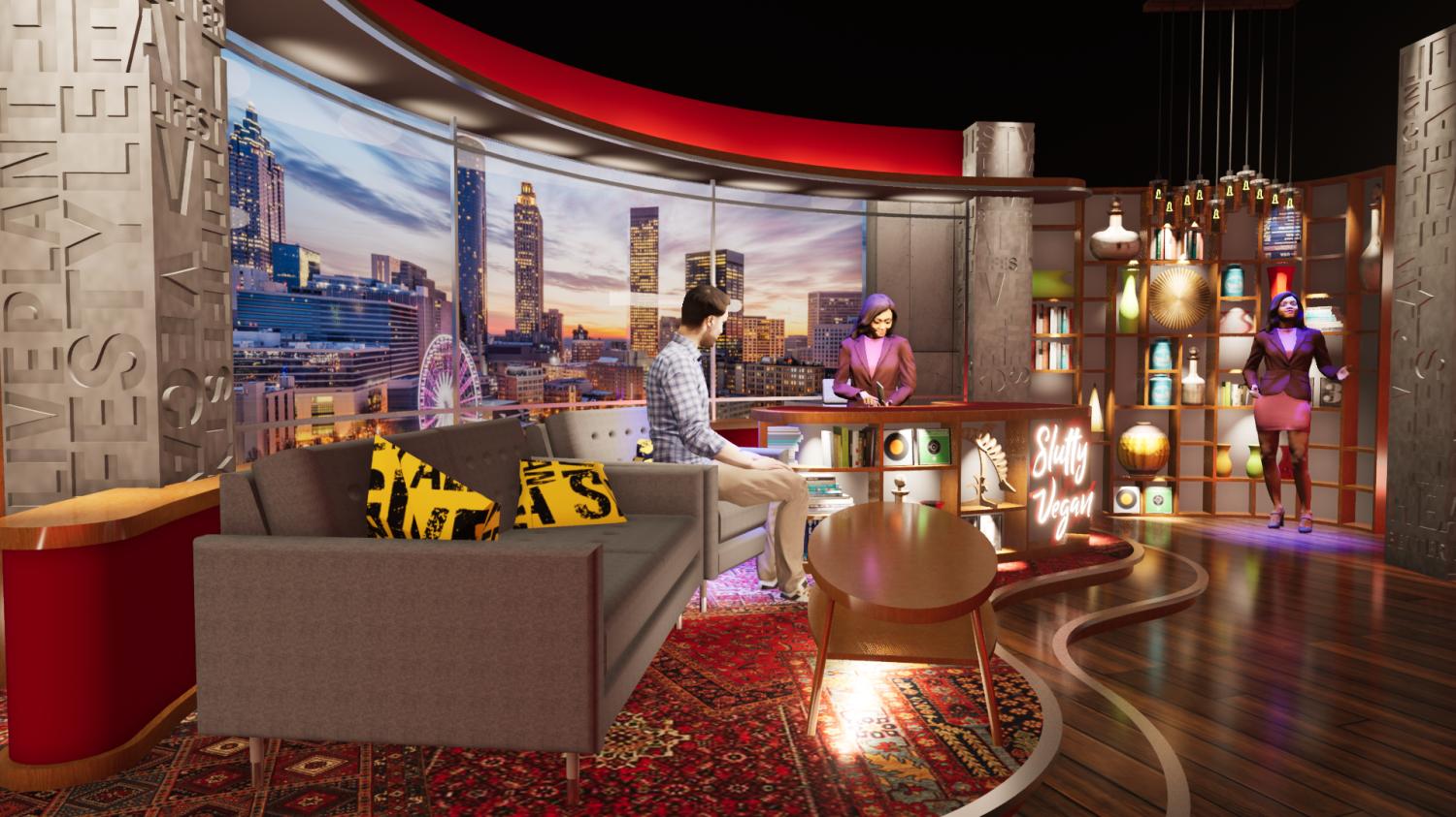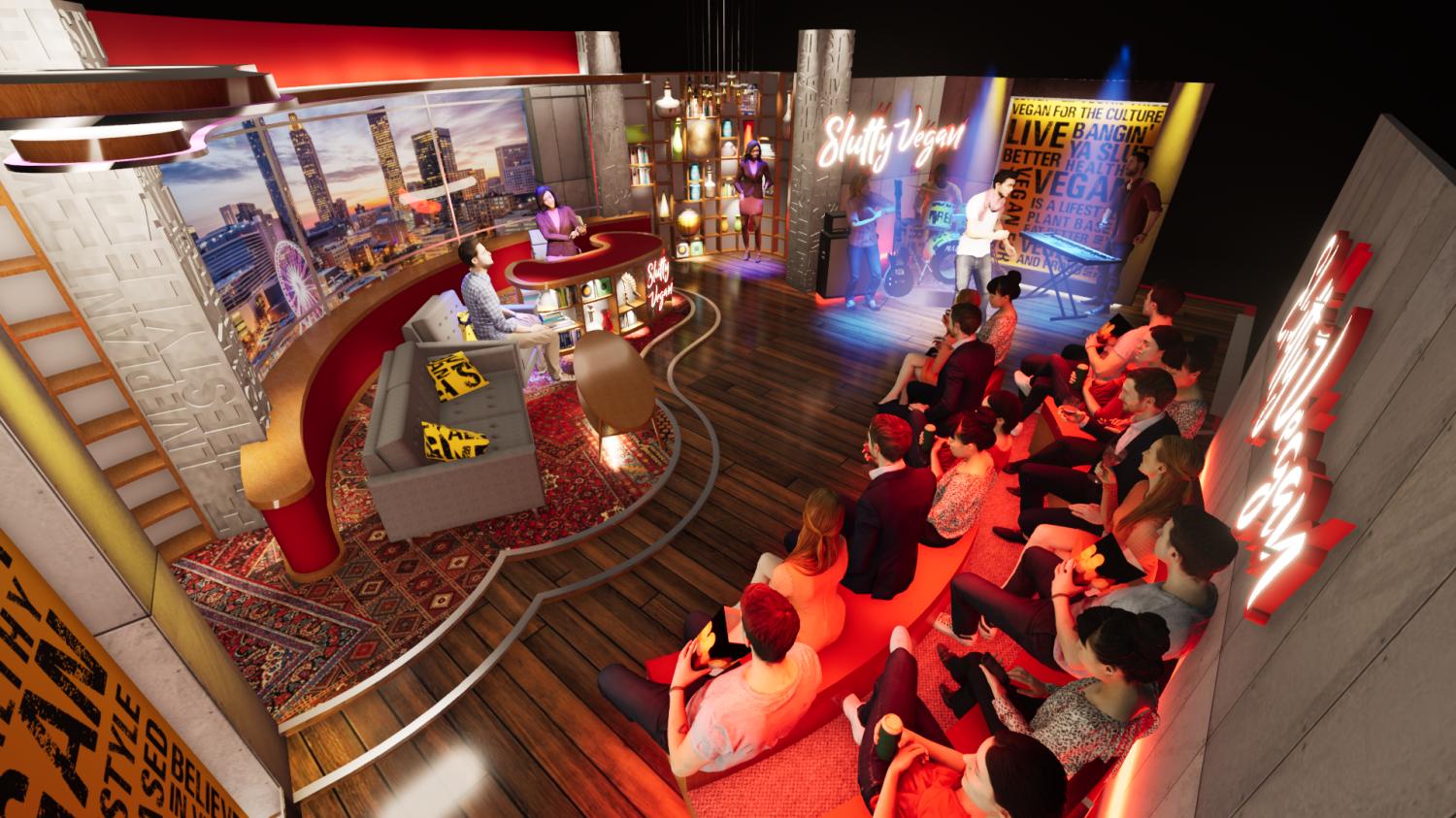 The highly successful Slutty Vegan restaurant chain approached me to create a small You Tube chat show set for them.  The set had to fit in an existing ( tiny ) warehouse space in Atlanta.