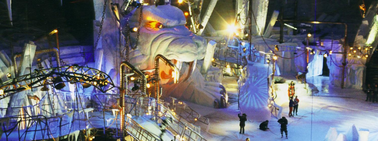 I HAD ALWAYS WANTED TO DESIGN A FILMIC JAMES BOND NEMESIS LAIR. MY BRIEF FOR THIS ICE SKATING COMBAT GAME SHOW WAS "THINK MOVIE SET ..NOT TV GAME SHOW " ..BIG MISTAKE, NEVER ASK ME TO THINK BIG BECAUSE THIS IS WHAT CAN SPILL OUT OF MY HEAD.